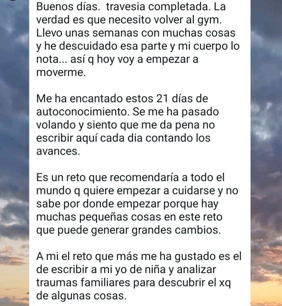 En estos 21 días he reunido algunos de los ejercicios más transformadores que he hecho en mi vida. Herramientas sencillas, pero poderosas, que me han ayudado a conocerme mejor, sanar, tomar decisiones importantes y reconectar con lo que de verdad importa.